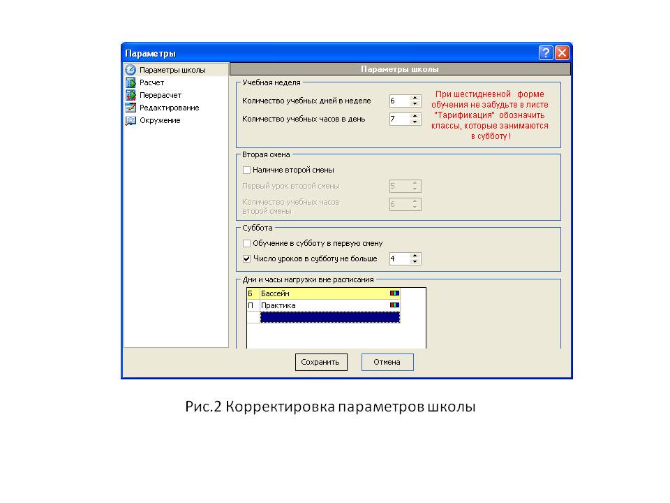 Завуч и автор программы встретились ровно в полдень солнечным майским днем. Решили опробовать возможности программы на текущем расписании на второе полугодие. Начали, как водится, с исходных данных. Первым делом откорректировали основные параметры школы: задали шестидневную рабочую неделю, максимум семь уроков в день и четыре в субботу, а также виды нагрузки вне школьного расписания (бассейн и практика в ВУЗе) (Рис.2).
