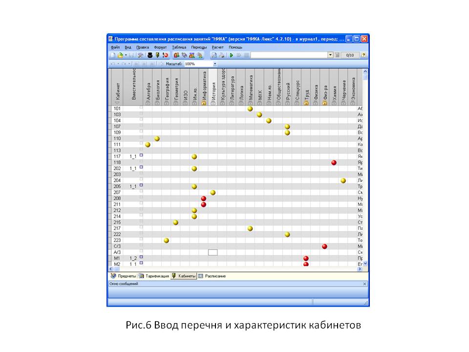 Добрая половина российских школ испытывает затруднения с распределением кабинетов среди учителей, в особенности, если кабинеты специализированные и соответствующие предметы не могут быть проведены в любом свободном помещении. В программе этот вопрос очень серьезно проработан. Имеется возможность задать общий перечень кабинетов, вместительность кабинета, его предметная направленность, а также одного или несколько ответственных учителей (Рис.6).